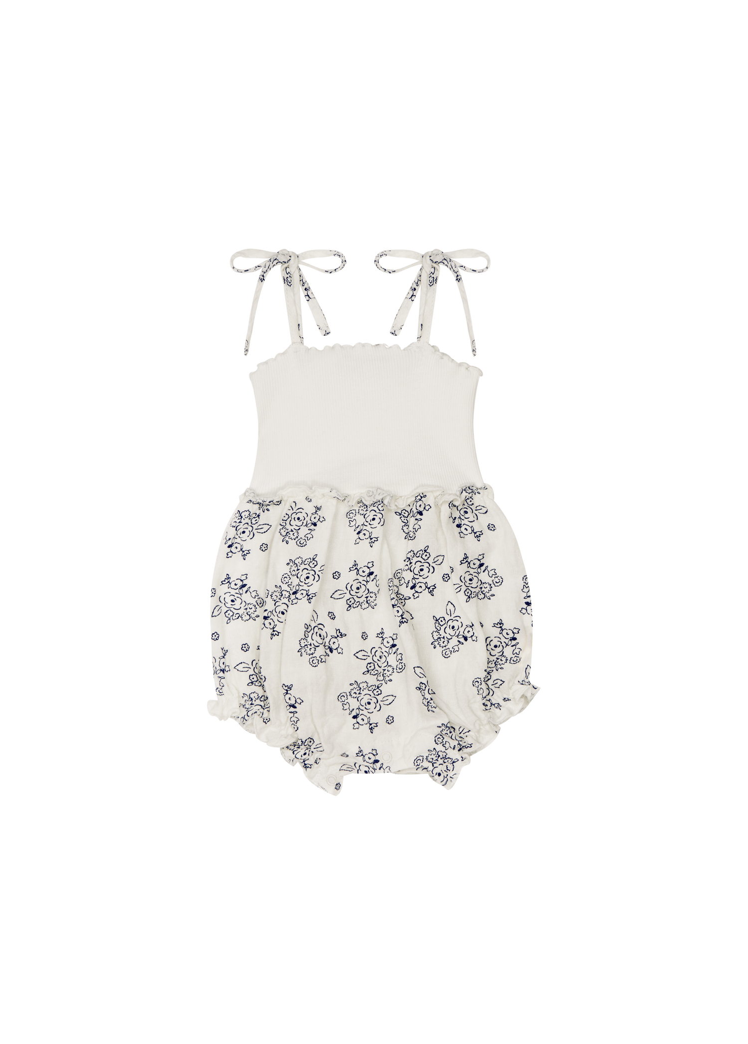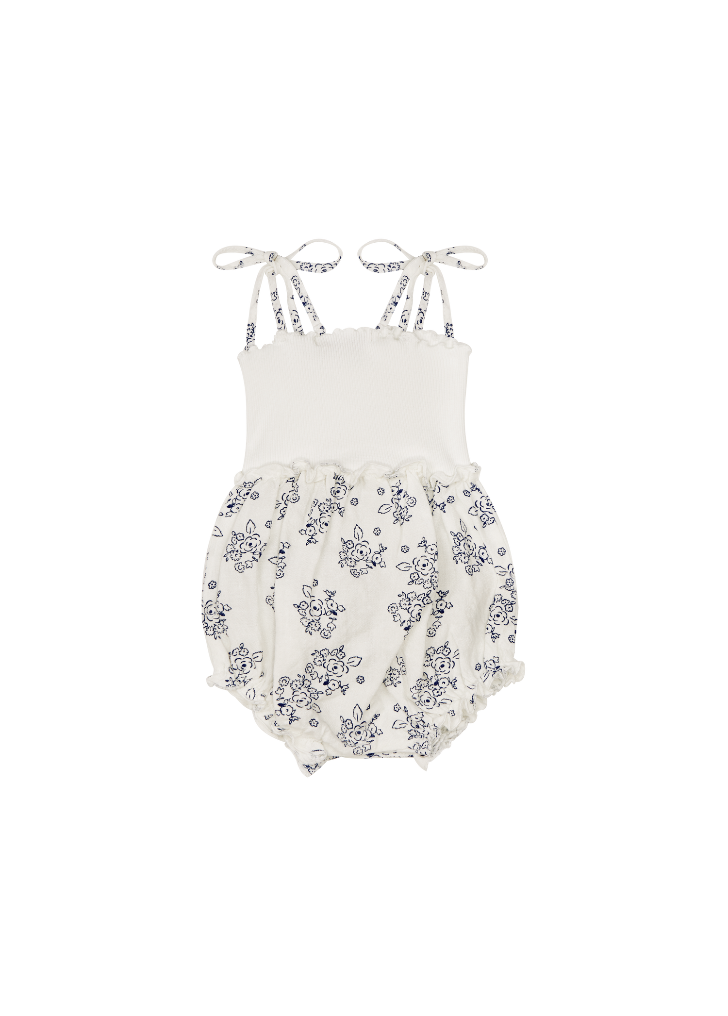 Short skirt with top piece in 1*1 rib and straps and bib in 100% linen with our flower print.