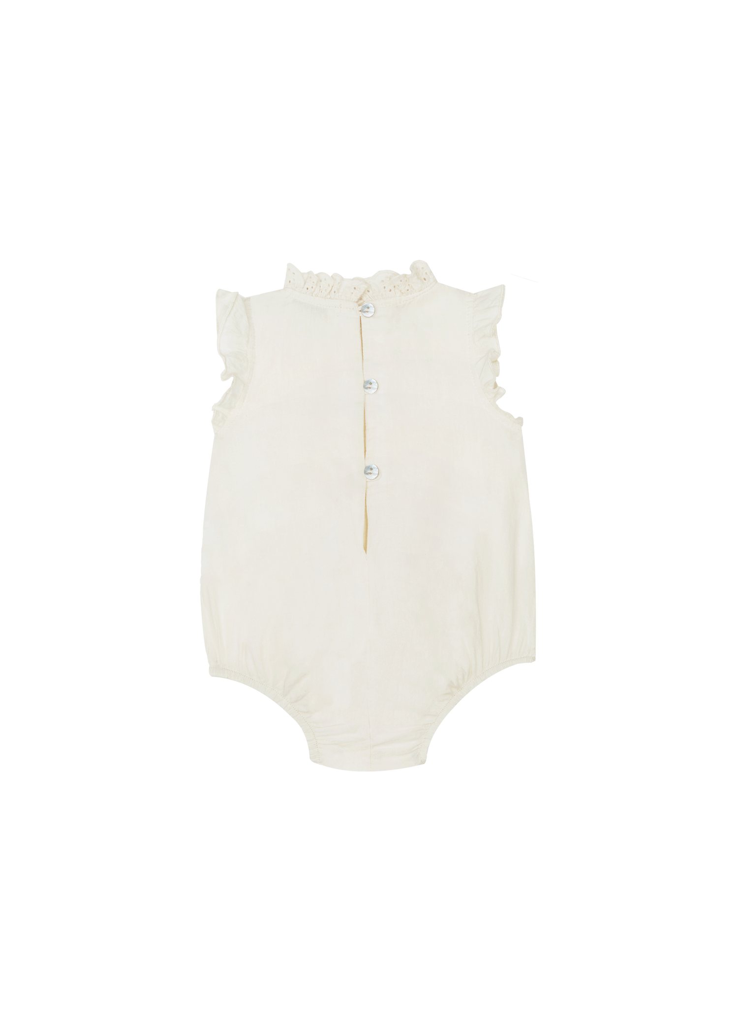 Liberty fabric short sleeves and short trousers with elastic and frill, square neckline. Opened back.