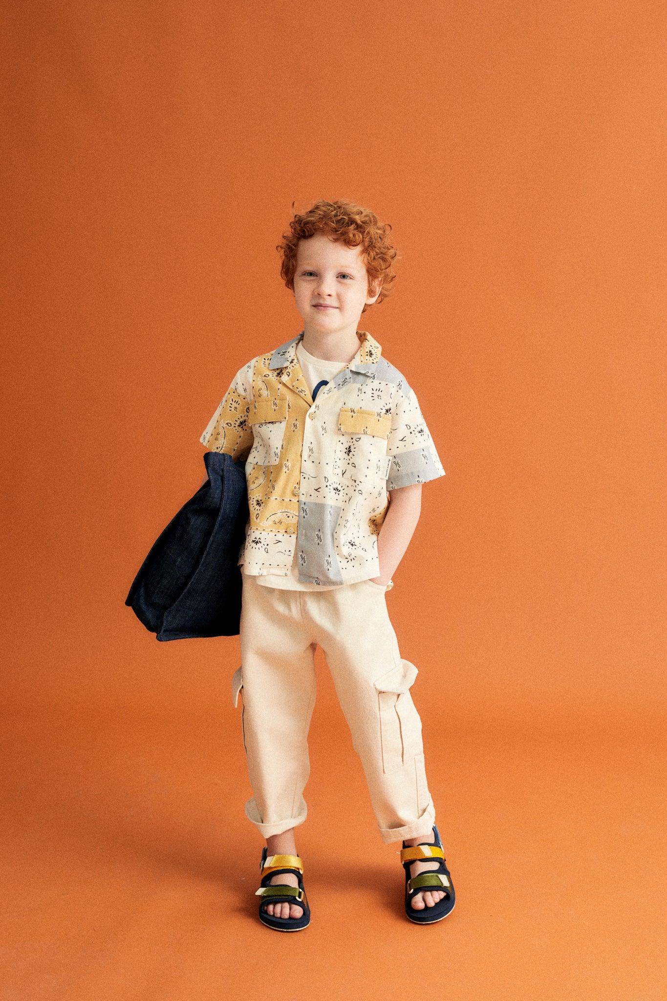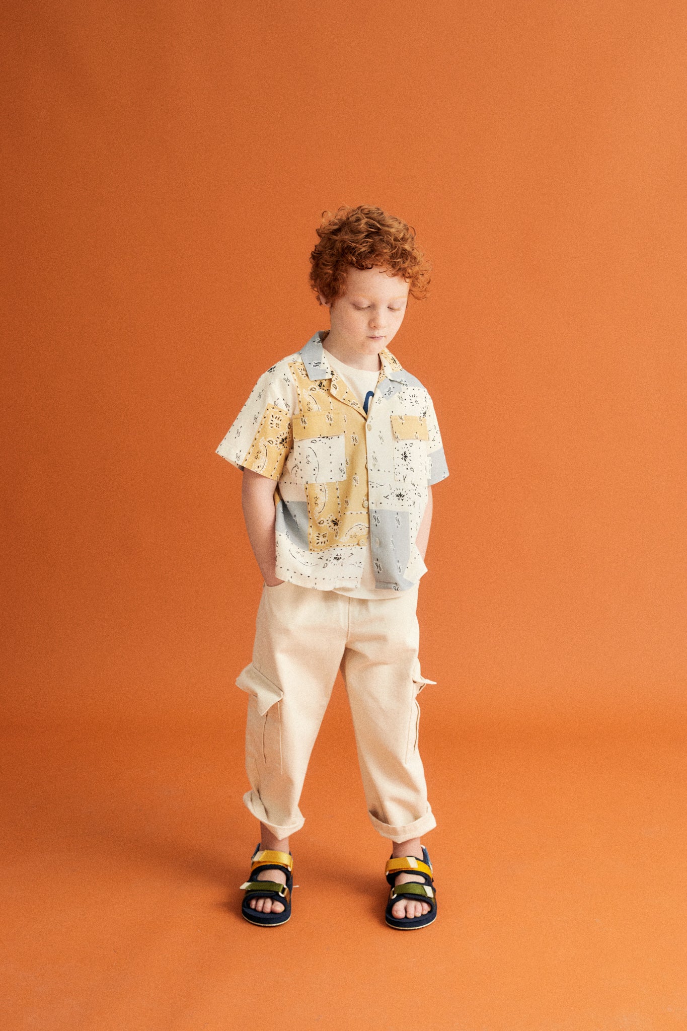 Shirt in organic cotton fabric with our bandana print with pajama collar, short sleeves and patch pockets on the front.