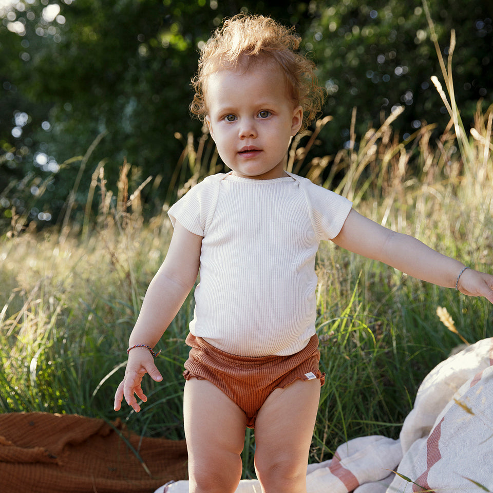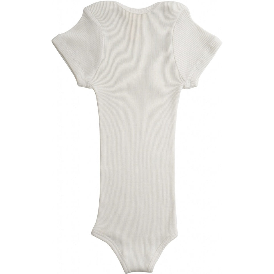 Seamless short-sleeve body in soft silk-cotton mix, with envelope neck opening. YKK nickel-free snap buttons.