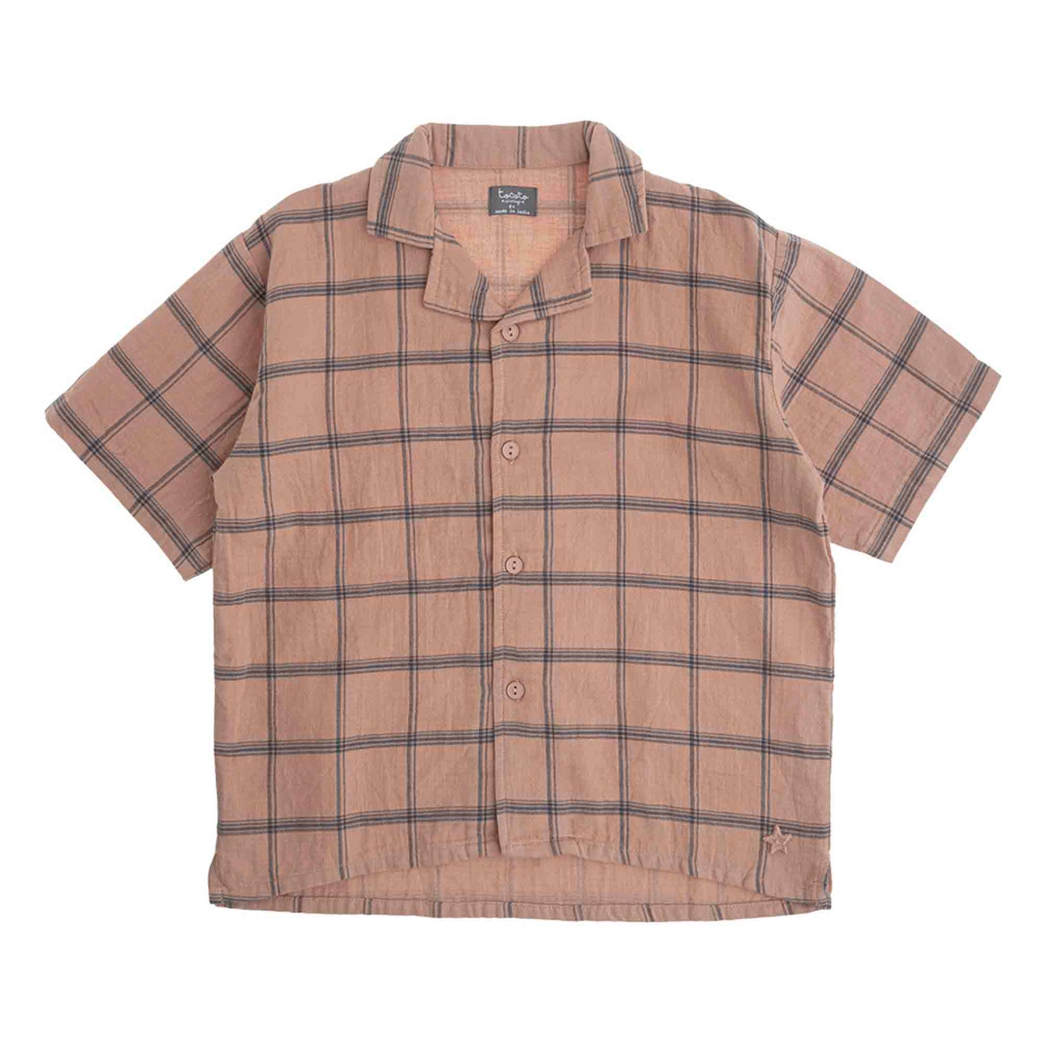 Short-sleeve Havana shirt with check print. With lapel and buttoned in front. 100% organic cotton.
