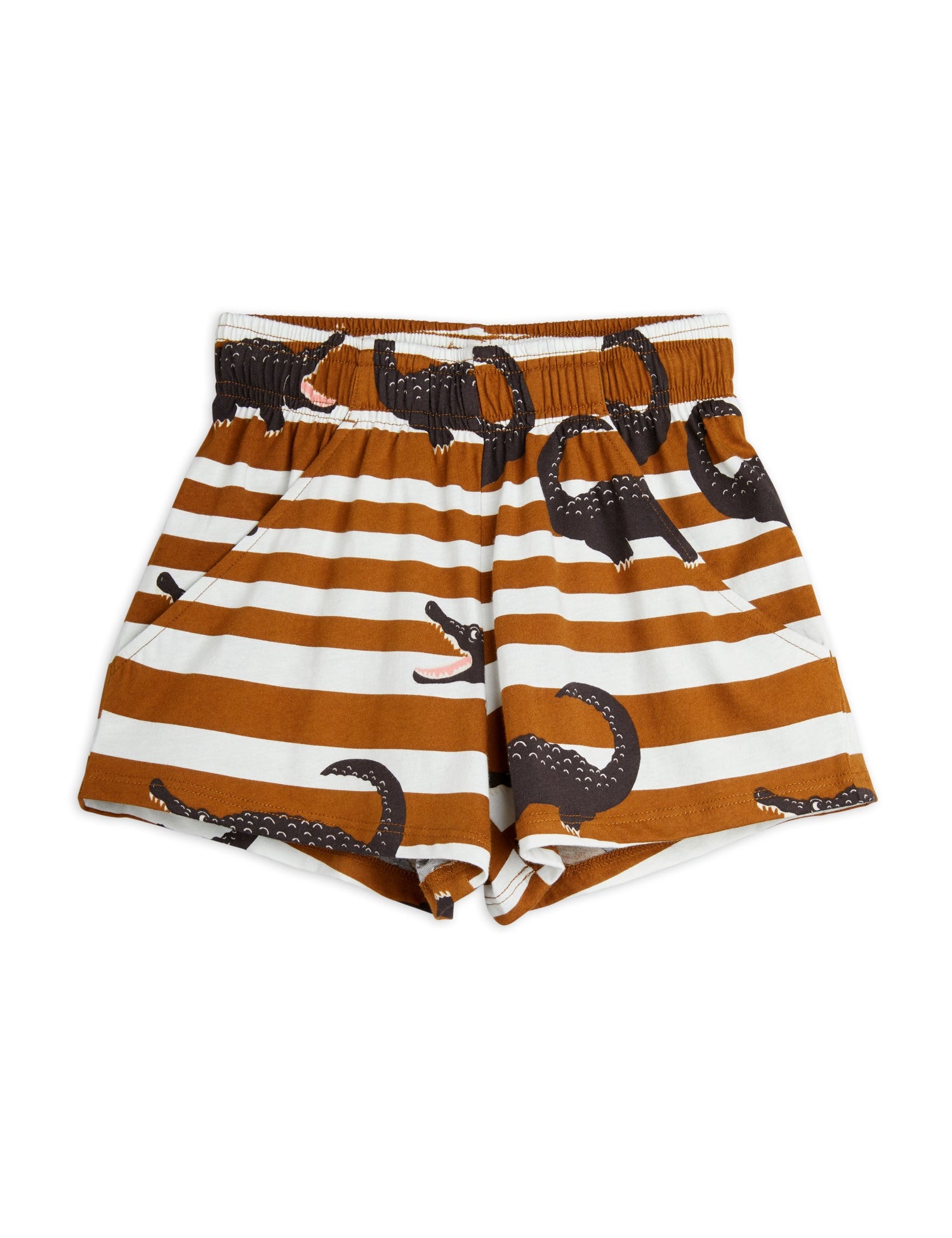 Bruna randiga shorts med heltäckande Crocodile-print, tillverkade i 100 % GOTS-certifierad ekologisk bomull. Shortsen är designade med två fickor och en hög midja med resår och dragsko på insidan.