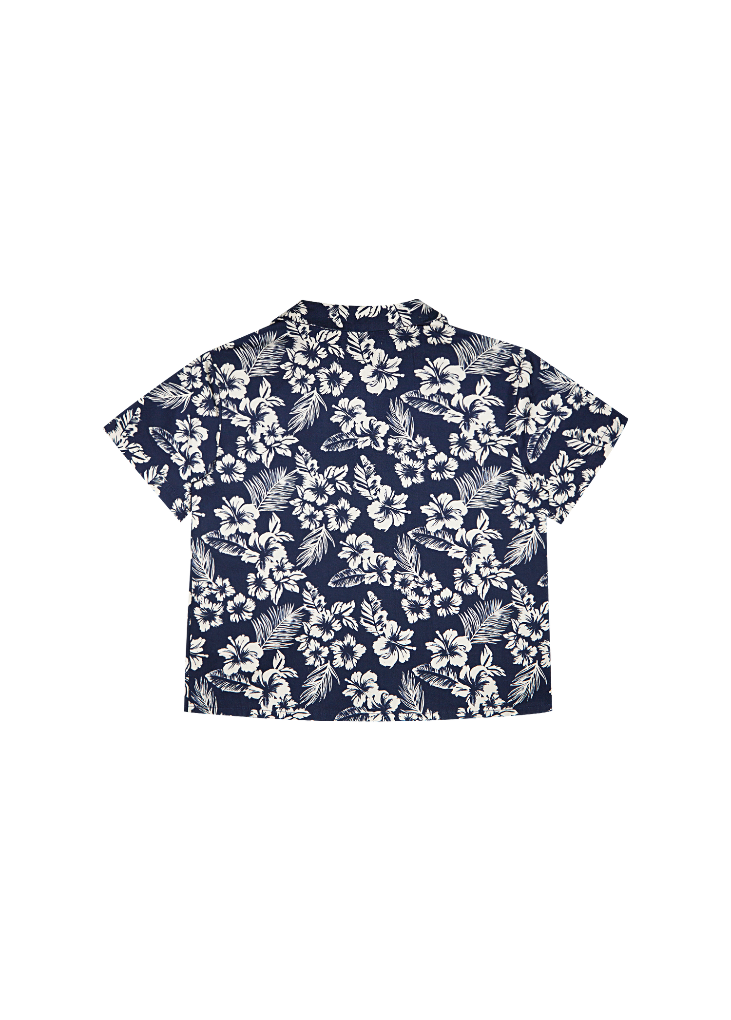 Shirt in fine twill cotton fabric with our hibiscus print. Open front pyjama collar and short sleeves.