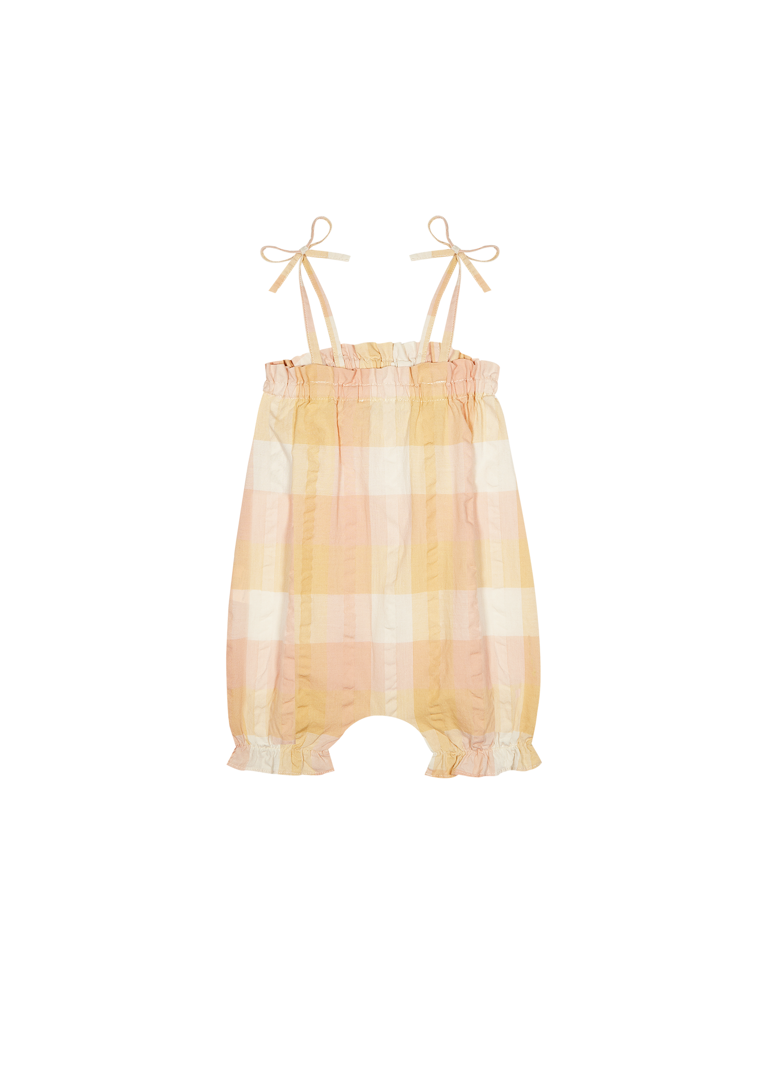 Baby romper suit in lightly seersucker plaid fabric. Straight neckline with elastic and frill at the bottom. Thin knotted shoulder straps, Shorts open at the bottom with snaps.