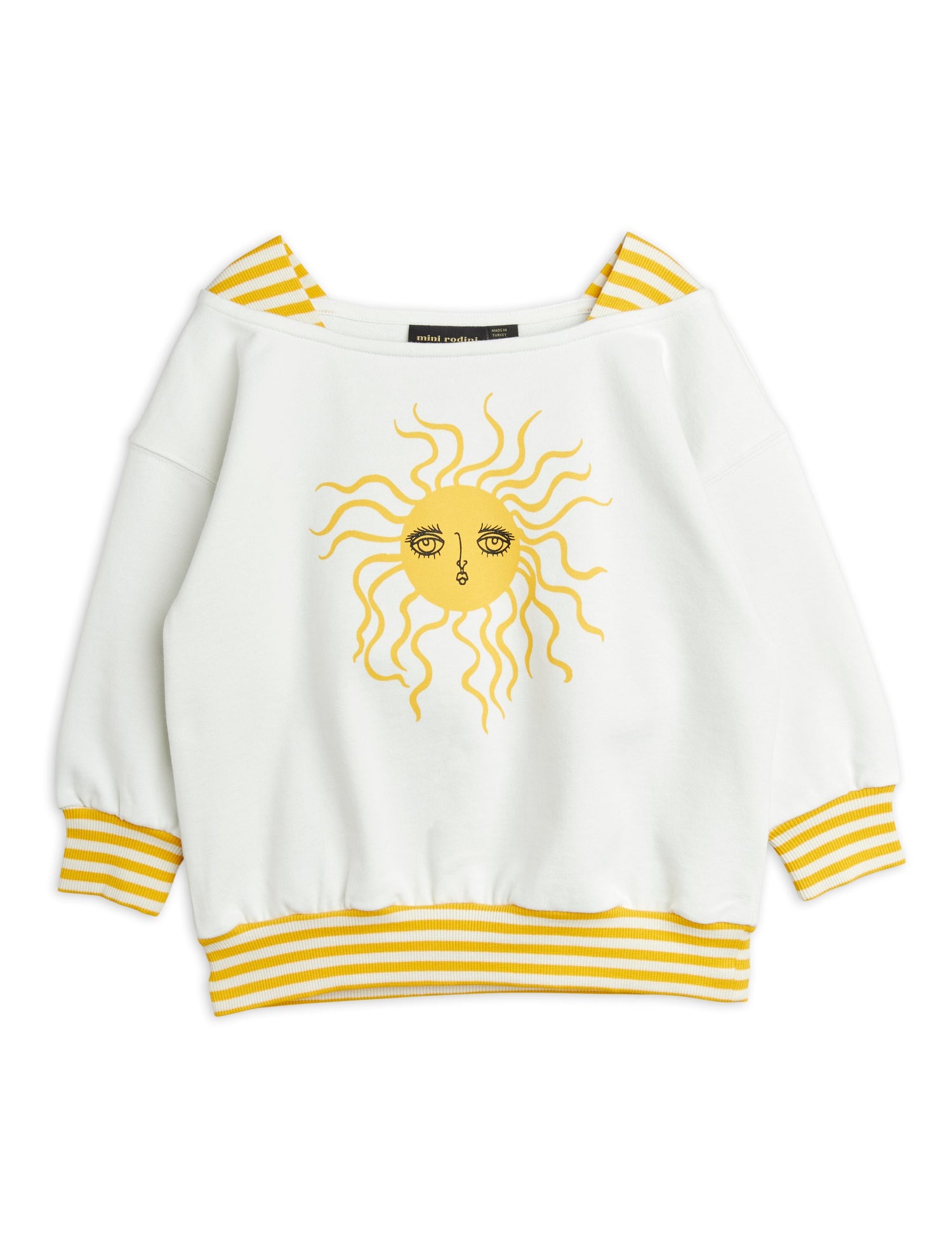 Känn solens strålar även när det är molnigt i denna sweatshirt med Sun-print, tillverkad i 100 % GOTS-certifierad ekologisk bomull. Sweatshirten är designad med lätt nedhasade axlar och båtringning med ribbade gulrandiga axlar som täcker och håller tröjan på plats. Den har även ribbad mudd vid ärmslut och nederkant med gula ränder.